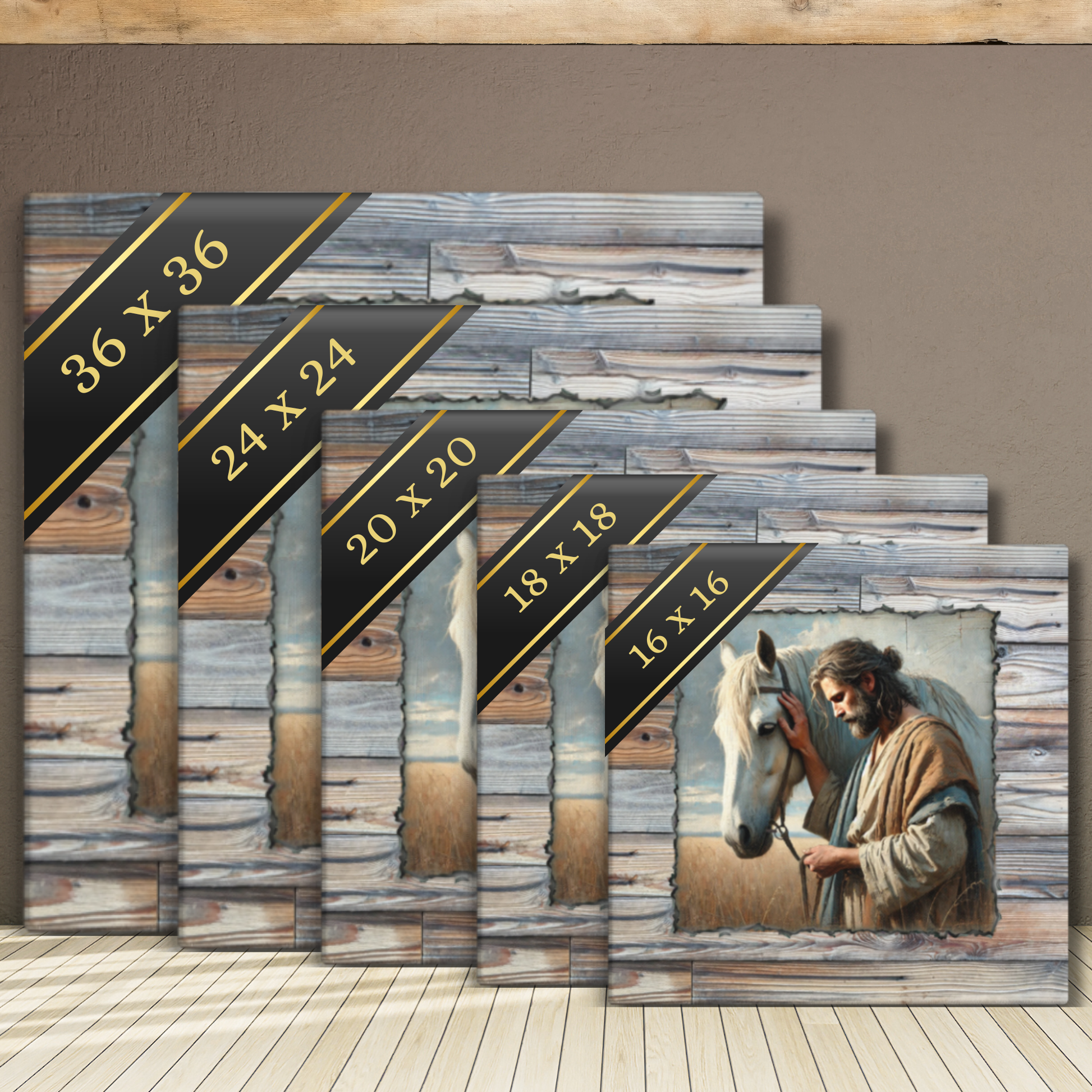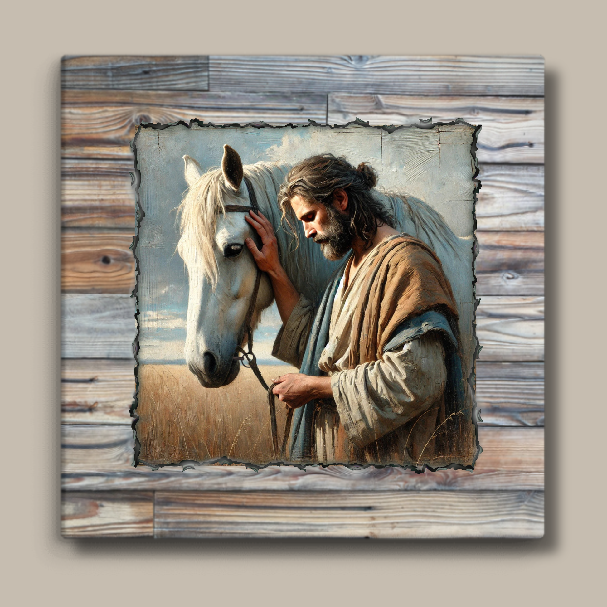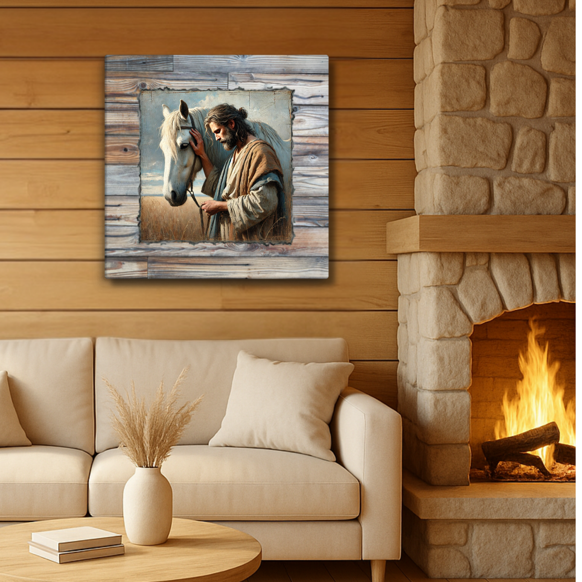 Bring a sense of peace, faith, and devotion into your home with this Christian wall art featuring a humble saint in prayer beside a white horse. The tender scene, framed in a rustic wood-look border, captures a quiet moment of reflection and connection with God’s creation. Perfect for anyone who loves faith-based art, nature’s beauty, and meaningful décor.