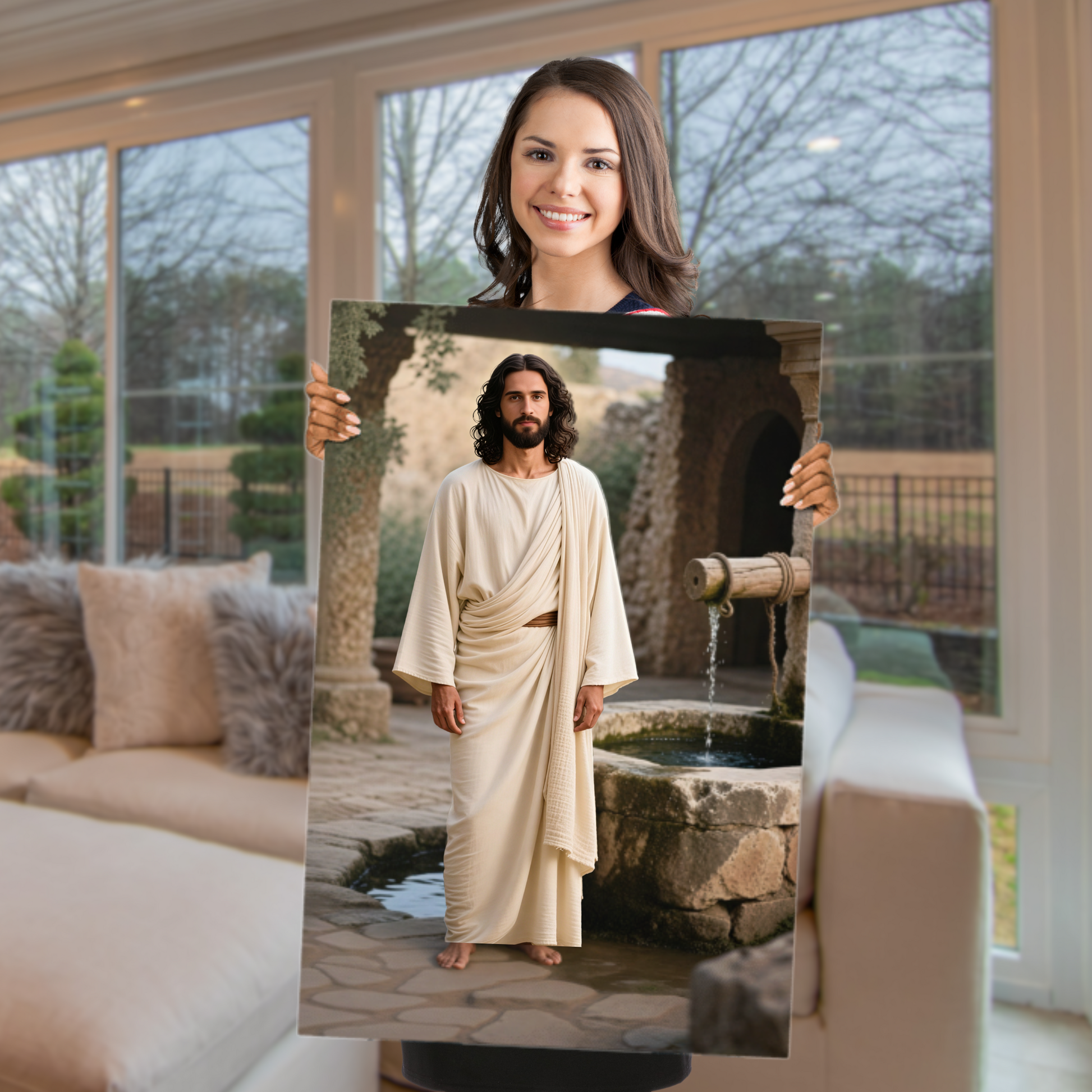 Invite peace, reverence, and light into your home with this stunning metal print art depiction of Jesus Christ standing beside an ancient stone well, symbolizing the eternal promise of living water. Dressed in soft, flowing robes of cream and sand tones, the Savior’s calm presence radiates compassion and divine strength. The serene background of weathered stone, olive trees, and gentle sunlight evokes the sacred landscapes of Jerusalem—simple, pure, and timeless.