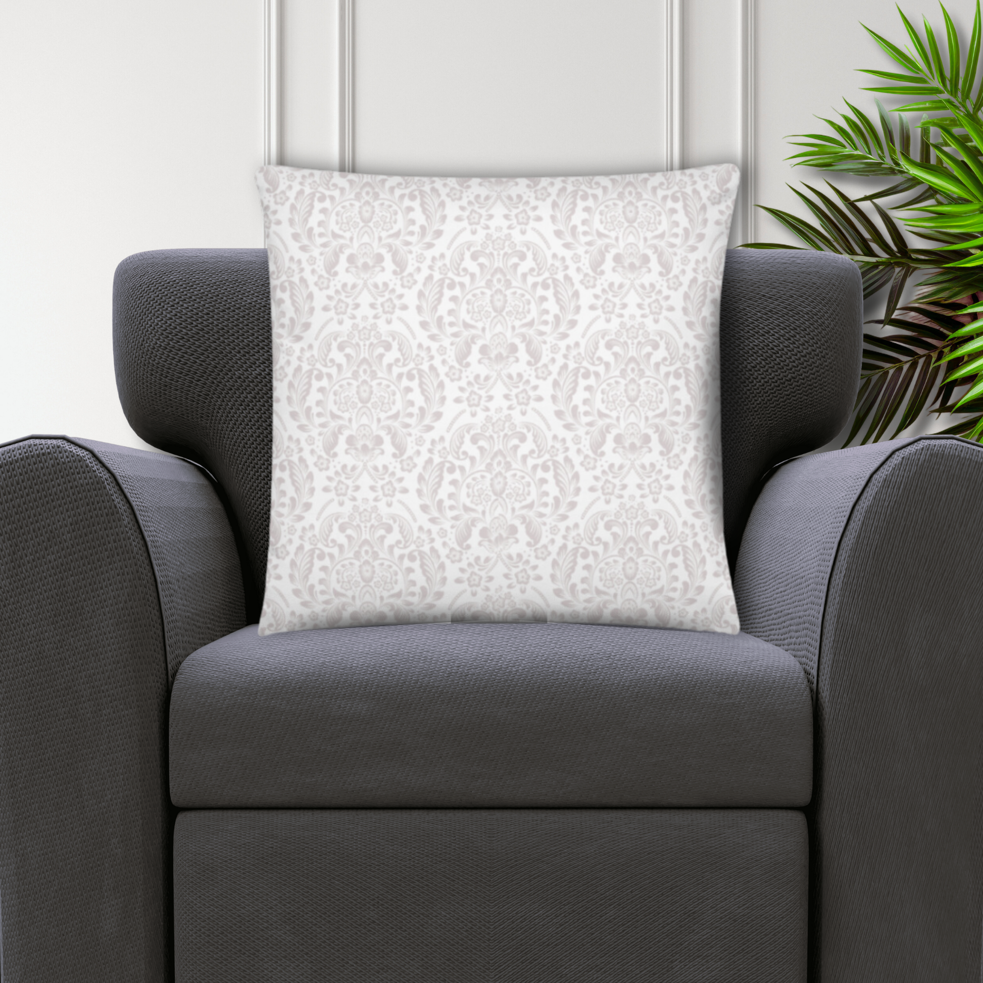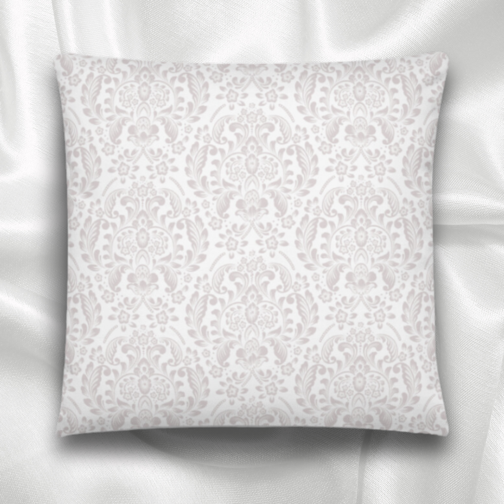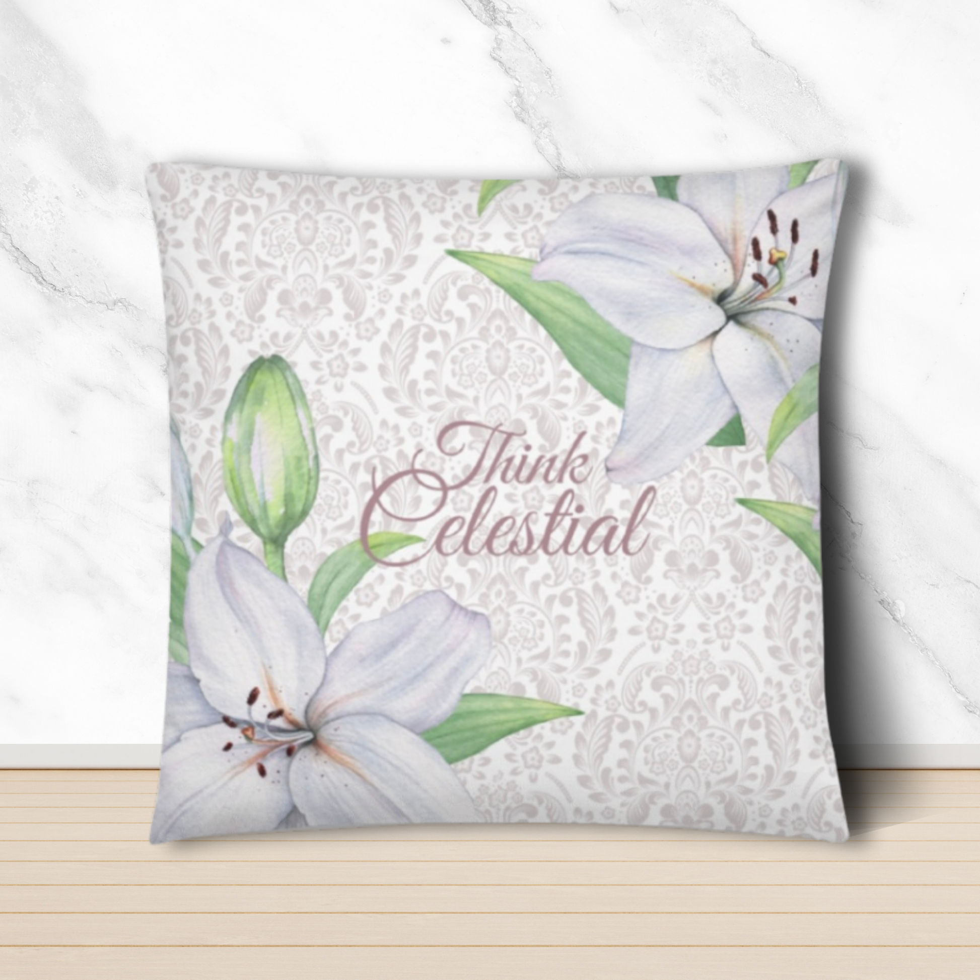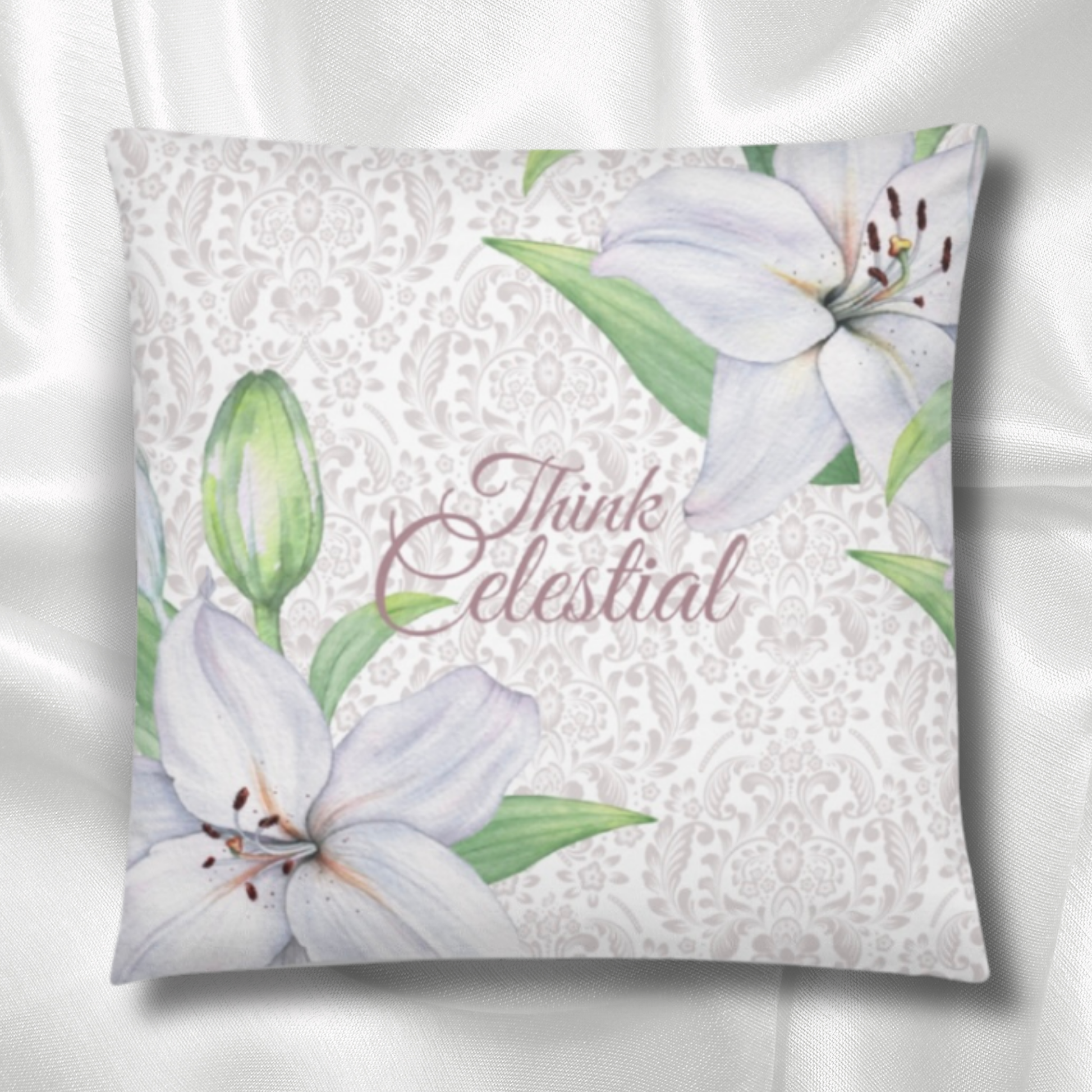 The soft background features a delicate damask pattern, symbolizing grace and divine order, while elegant white lilies bloom across the design—flowers that have long represented purity, resurrection, and the hope of eternal life. The words “Think Celestial” appear in graceful script at the heart of the pillow, encouraging you to lift your mind above the noise of the world and dwell on the things of God.